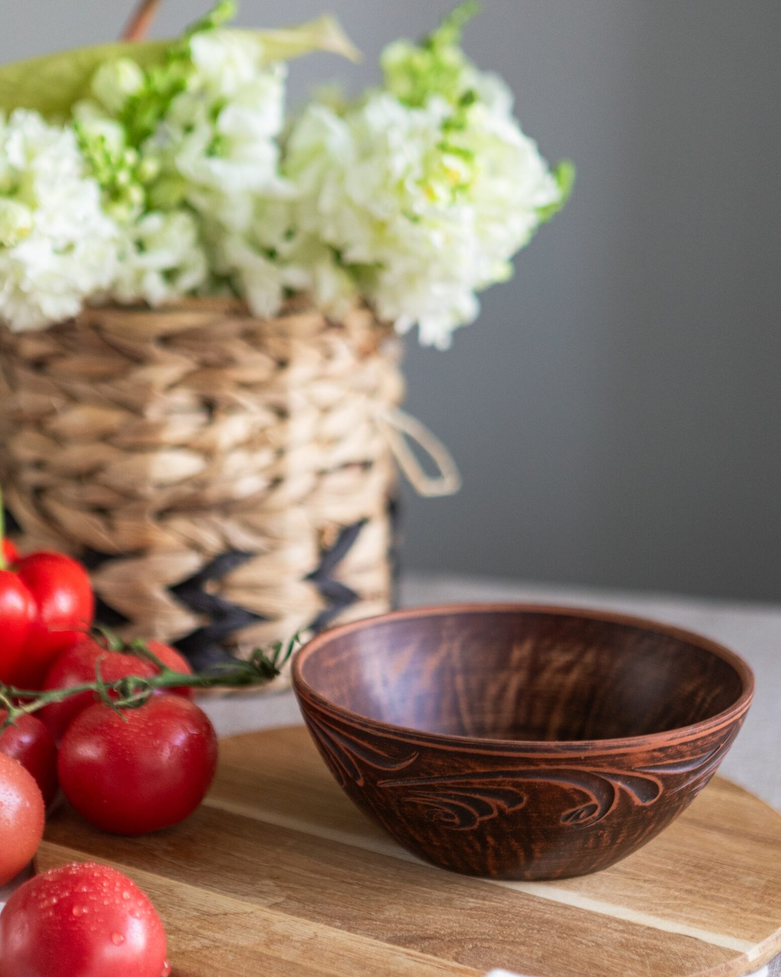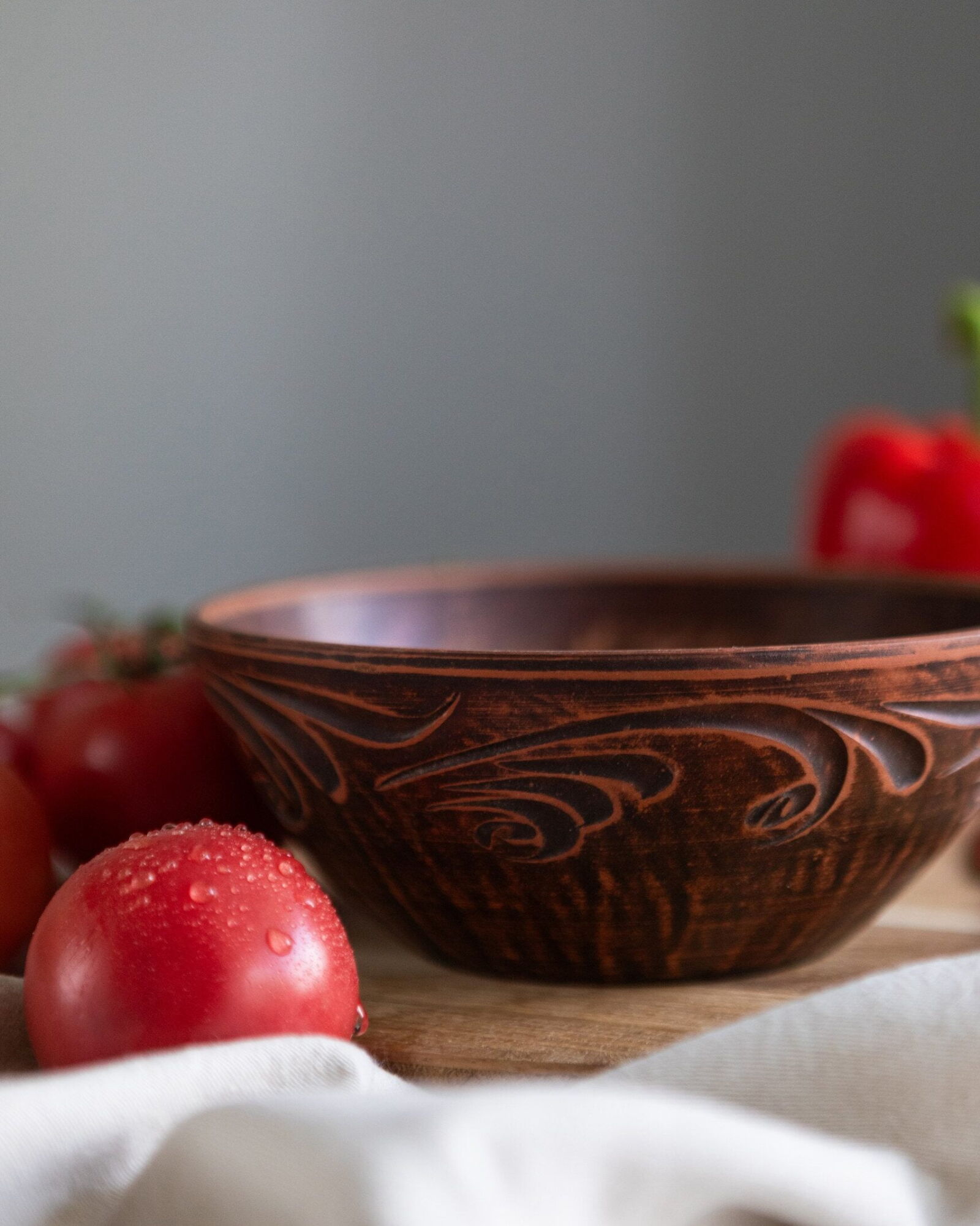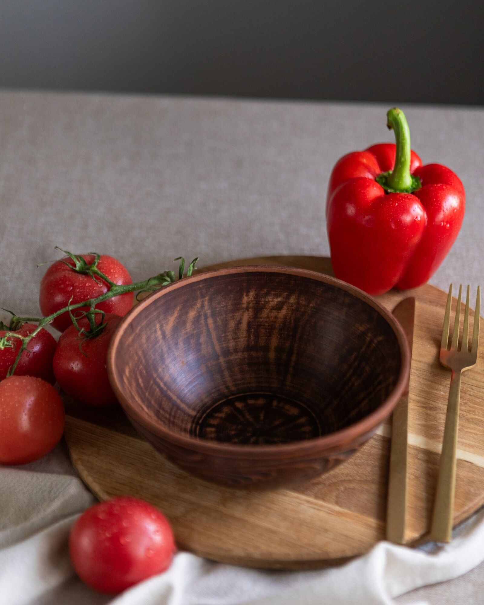 теплим натуральним темно-каштановим кольором та неповторним малюнком, роблячи посуд приємним для дотику.