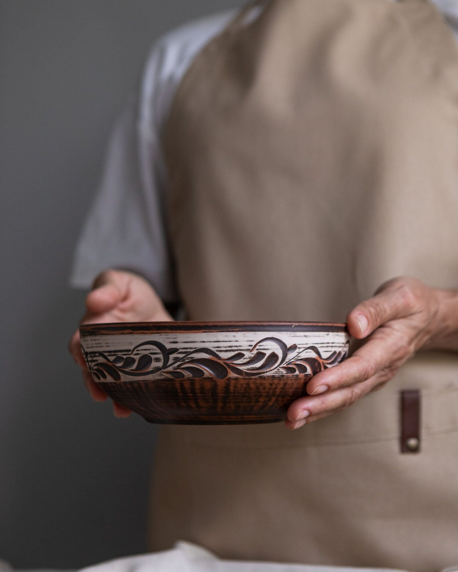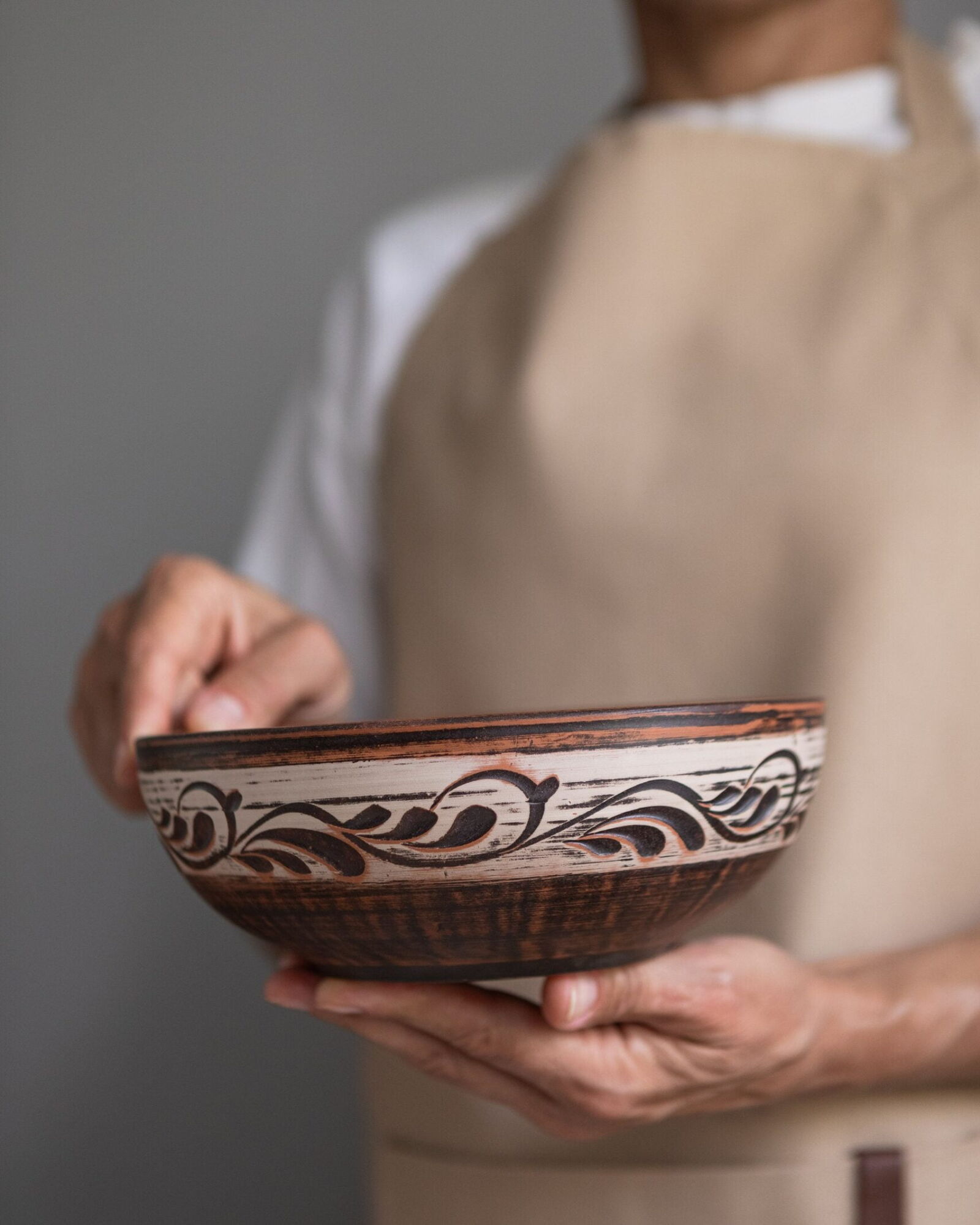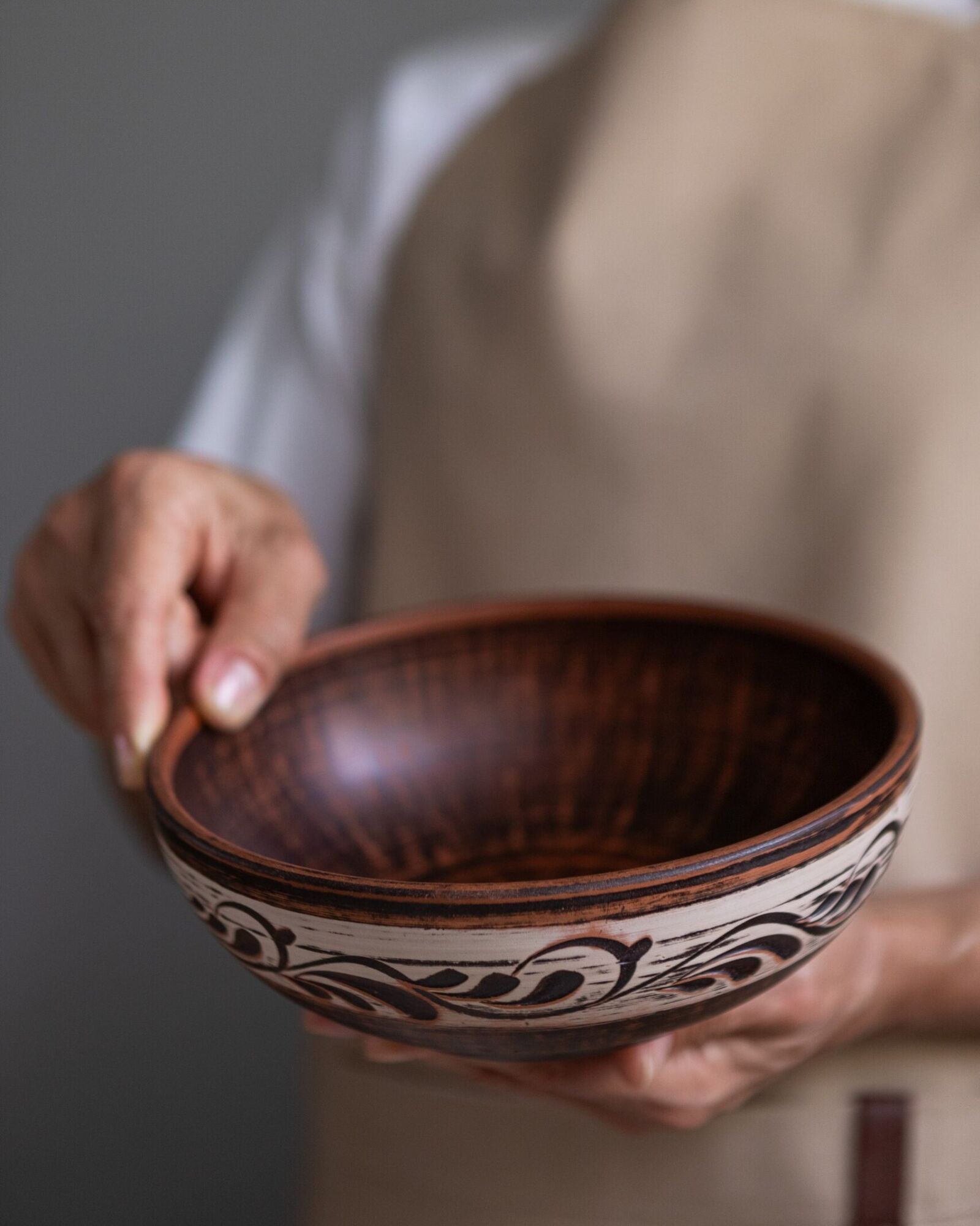 Глиняний посуд має ексклюзивний, шоколадно-коричневий, задимлений відтінок. Добре зберігає тепло та прохолоду, а також свіжість продуктів тривалий час. Страви виходять ароматні та соковиті. При виготовленні цього посуду використовувалися спеціальні технології – натуральна та екологічно чиста сировина. Гончарний посуд без глазурі, виглядатиме на вашій кухні, дуже індивідуально та оригінально 💋