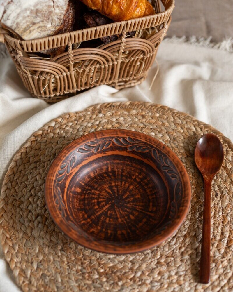 теплим натуральним темно-каштановим кольором та неповторним малюнком, роблячи посуд приємним для дотику.