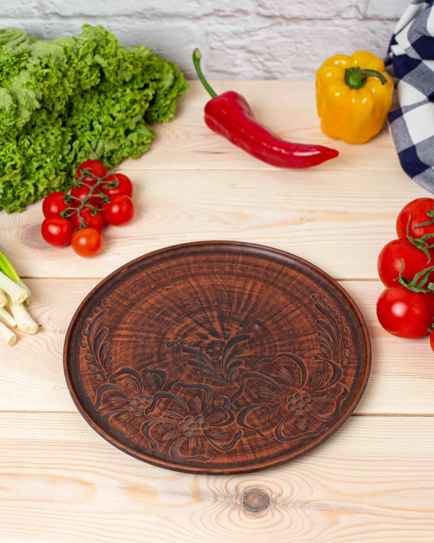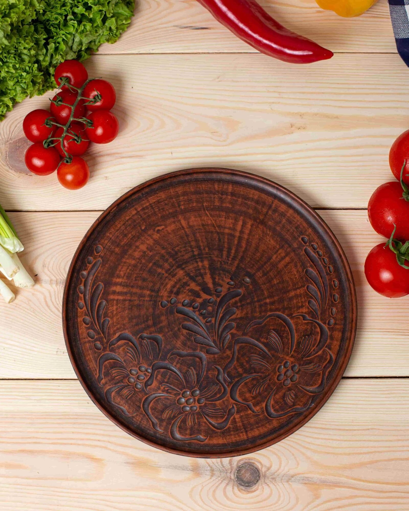 Глиняна тарілка круглої форми призначена для подачі: гарячих других страв, гарячих закусок, холодних страв та закусок. Дуже красиво виглядають на столі, при подачі гарячих страв ще довго зберігає тепло. Різьблення зроблено вручну.