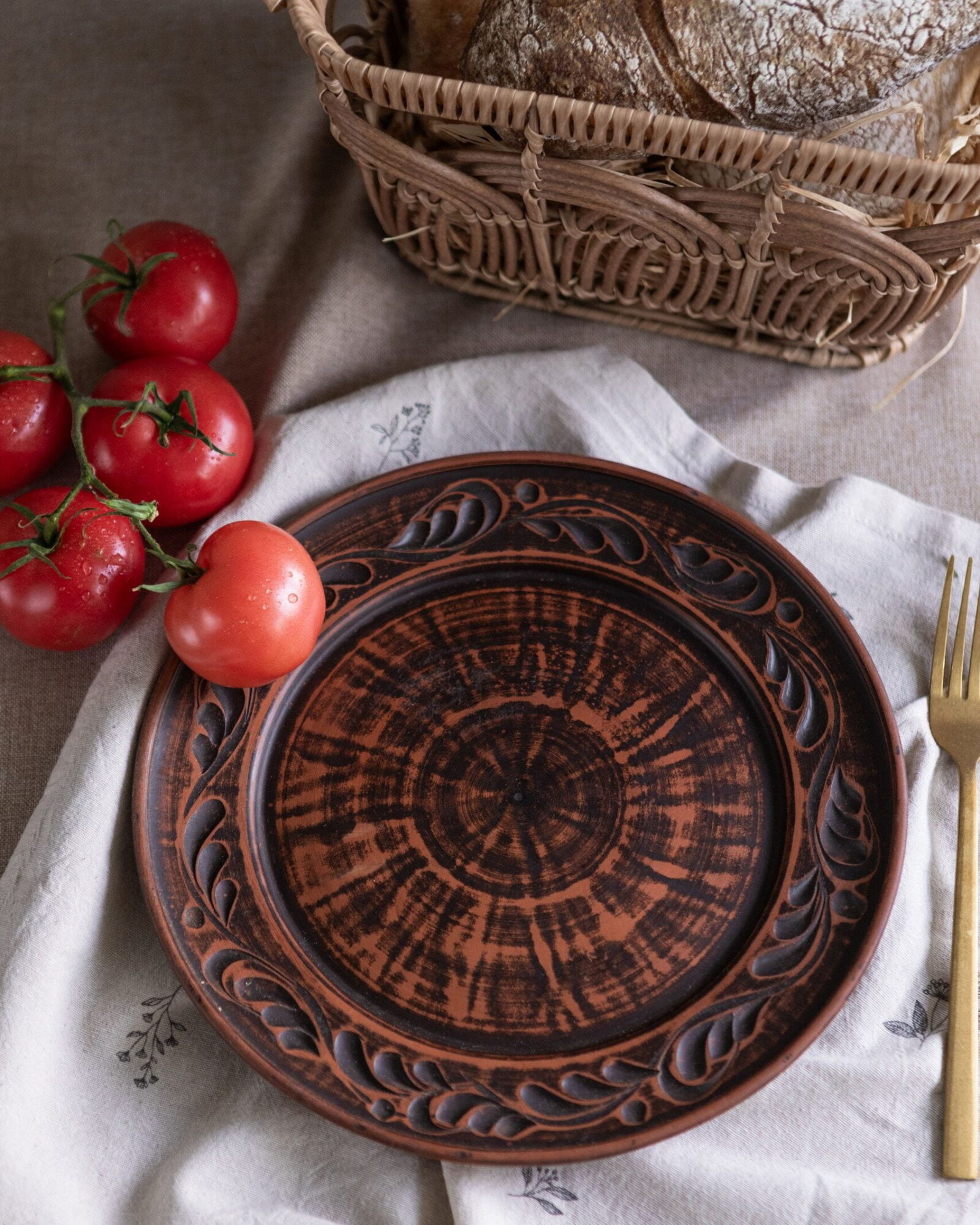Глиняна тарілка круглої форми призначена для подачі: гарячих других страв, гарячих закусок, холодних страв та закусок. Дуже красиво виглядають на столі, при подачі гарячих страв ще довго зберігає тепло. Різьблення зроблено вручну.